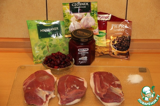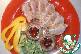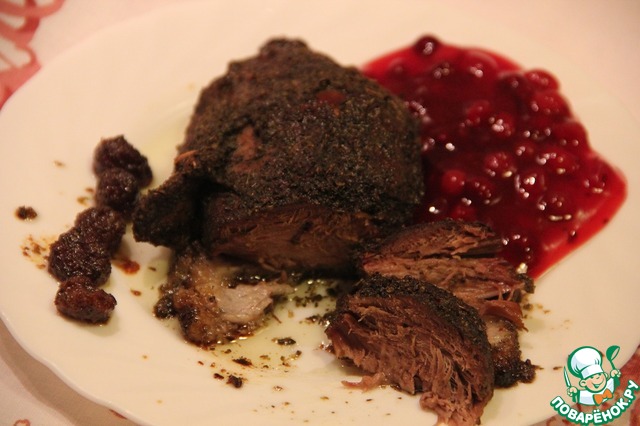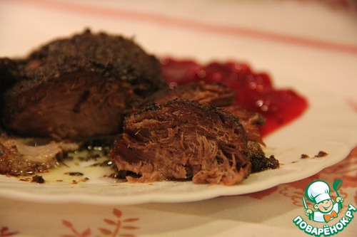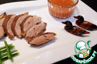 Утиная грудка, приготовленная таким способом, очень нежная и сочная. Подаём с клюквенным соусом.