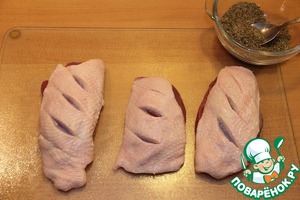 Грудку вымыть и просушить бумажным полотенцем. Co стороны кожи делаем надрезы.