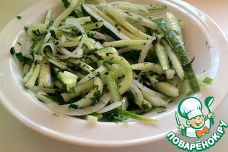 5. Лук нарезаем мелко, чем мельче тем лучше. Залить лук холодной водой и оставить на 10-мин. Воду слить и добавить немного разбавленый уксус. Солим перчим добавляем к салату лук и майонез.