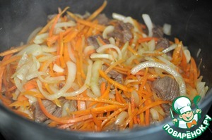Далее кладём в казан нарезанные лук и морковь и обжариваем, периодически помешивая, 20 минут.