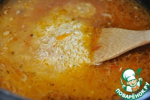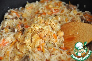 6. В приготовленный зирвак заливают сразу всю воду и дают ей закипеть, после чего закладывают рис, соль, пряности.