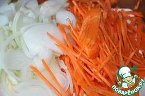 Лук нарезаем полукольцами, морковь натираем соломкой.