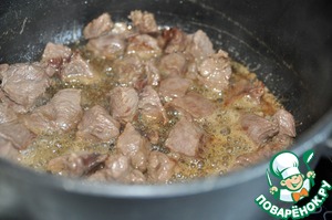 В хорошо нагретом казане на масле обжариваем до румяности мясо. -