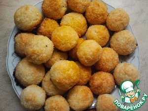 Для начала взбейте яйца с сахаром (сахар должен раствориться), добавьте ванилин. Затем всыпьте в яичную массу кокосовую стружки замесите тесто. Оно будет немного рассыпчатым, поэтому, когда будете формировать шарики, обязательно смачивайте руки холодной водой. Это поможет вам накатать ровные шарики-печенюшки