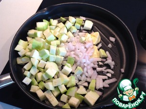 Цуккини нарезать на кубики, лук и чеснок мелко нарезать. Потушить на сковородке со сливочным маслом, не закрывая крышкой.