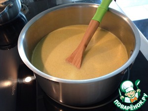 Добавить бульон, сливки, карри, куркуму и еще раз перемешать в блендере. Поставить на огонь, довести до легкого закипания.