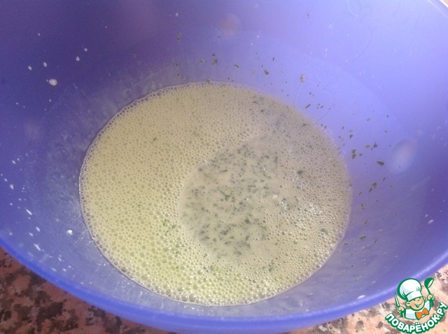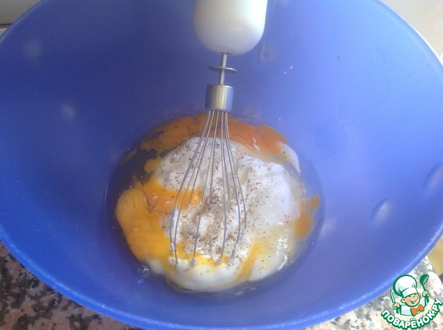 2 яйца взбить со сметаной. Добавить соль и перец черный по вкусу