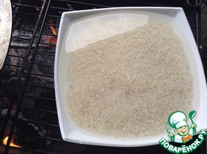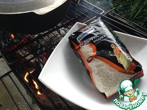 Накрываем крышкой. Вот этот сильный огонь убавляем (отодвигаем часть поленьев) и оставляем готовиться рис примерно на 20 минут.