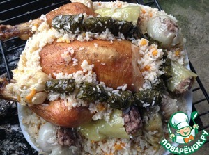 Сталик предлагат курицу готовить до конца и уже готовую класть на блюдо и сверху выкладывать плов с долмой.