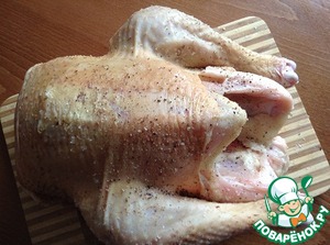 Курицу солим, перчим, посыпаем любимыми специями и запекаем в духовке почти до готовности. -