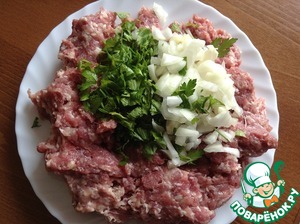 Берем готовый фарш ( у меня свино-говяжий), добавляем нарезанный мелко лук и зелень, соль, перец, зиру (по желанию).