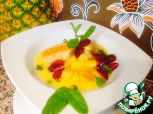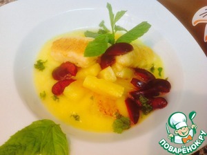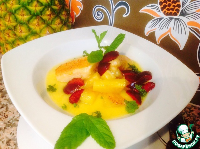 В глубокую тарелку вылить пюре из ананаса и горкой выложить ананасы и бананы. Украсить черешней и листиками мяты.
