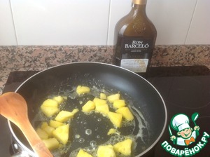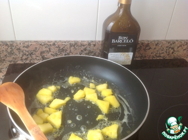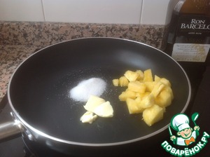 1 ст. Ложка сливочного масла, 1 ст. Ложка сахара и кусочки ананаса разогреть на сковороде на среднем огне до растворения сахара.