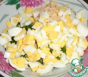 Начинка вторая состоит в следующем: сыр натереть на крупной терке, добавить к нему мелко порезанный зеленый лук, затем добавить порезанные на кубики вареные яйца. Перемешать и немного посолить.