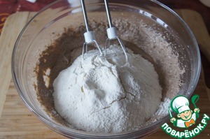 • Просеять муку с разрыхлителем. Взбивать тесто деревянной ложкой или миксером 2-3 минуты.