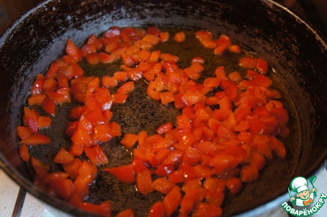 Болгарский перец нарезать небольшими кусочками и обжарить в растительном масле.