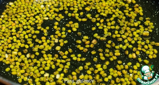 1. Маш промыть. Разогреть в глубокой сковороде 2 ст. л. масла и обжарить маш пару минут. Влить 300 мл. кипятка и готовить 20 минут на среднем огне.