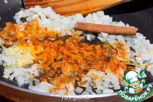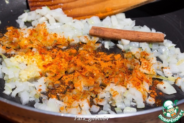 3. Лук порезать кубиком. Разогреть в сковороде 2 ст. л. масла и чуть обжарить лук. Добавить специи, тертый имбирь и палочку корицы и обжарить в течении 5 минут. Во многих рецептах в состав кхичди входит лук, однако, мне встретилась информация, что в традиционной ведической кухне лук не используют, поэтому для аутентичности этот шаг можно опустить и специи добавить сразу в смесь риса и маша одновременно со шпинатом. Но лично мне вариант с луком по вкусу нравится больше.