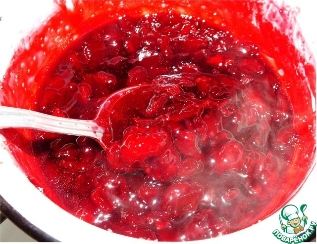 Для вишневой начинки необходимо перебрать вишню, промыть ее, удалить косточки. Вишню проварите с сахаром минуты 3-4, затем добавьте крахмал. Подержите еще минуты 2-3 на огне. Начинка готова.