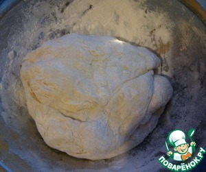 • Вот такое тесто получилось. Оно слегка липнет к рукам. Заворачиваем в плёнку пищевую его и отправляем в холодильник на час или 2. У меня ночь тесто находилось в холодильнике. (тесто можно любое другое Ваше любимое использовать, которое подходит для несладкой выпечки)
