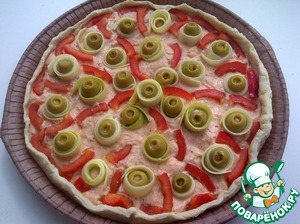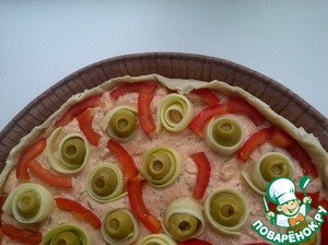 • Затем украсить наш пирог свёрнутыми лентами из кабачков, оливками, нарезанным на небольшие брусочки красным болгарским перцем. Ножом срезать лишнее тесто по краю формы. Загнуть внутрь края теста.