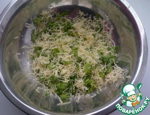 • Натереть на мелкой тёрке сыр. Нарезать мелко зелень петрушки. Перемешать.