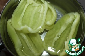 Перец вымыть, разрезать вдоль пополам, удалить плодоножки с семенами, залить кипятком и дать остыть. Затем слить воду.