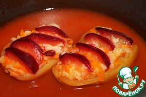 Перец наполнить фаршем из риса и овощей, сверху выложить сливы. Выложить на противень (как вариант - на сковороду или в мультиварку). -