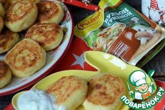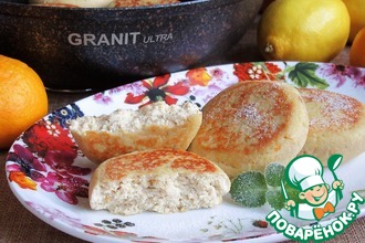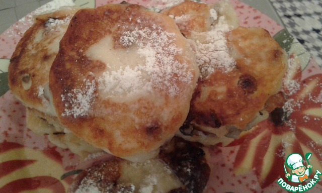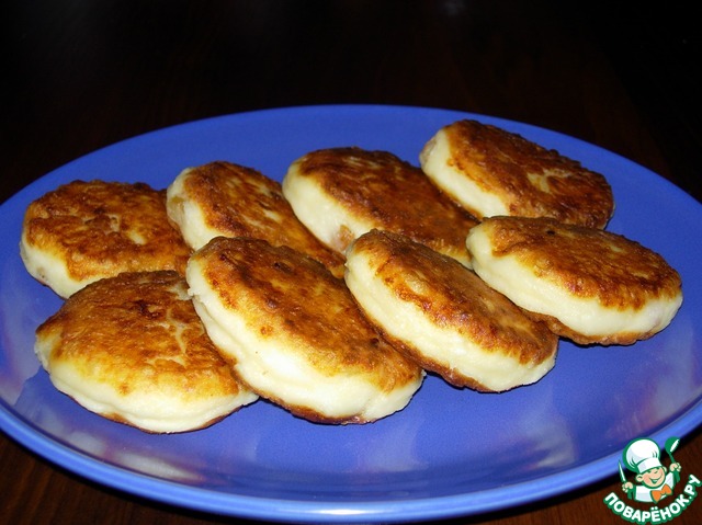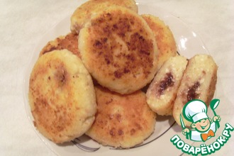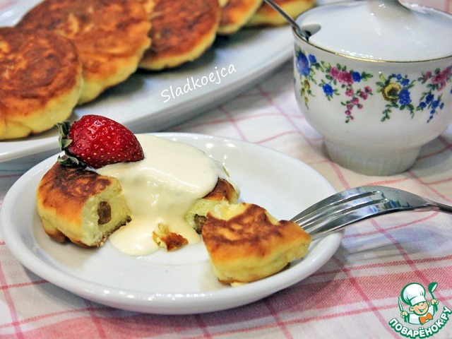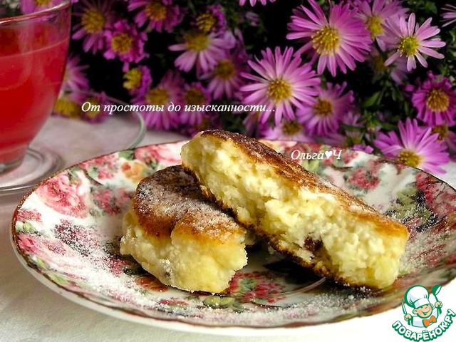 Смешать все ингредиенты, ложкой аккуратно выкладывать в муку и осторожно сформировать сырники.
