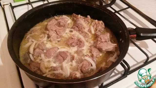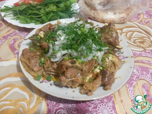 • Моем баранину, очищаем от плёнок. Нарезаем баранину средними кусочками. Лук и перец нарезаем полукольцами. На разогретую глубокую сковороду или казан укладываем куски баранины, и обжариваем 5 мин. Мясо должно быть жирным! Добавляем лук и перец, заливаем водой. Накрываем крышкой на 7-мин.