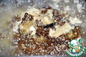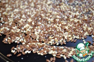 Смешать семена кунжута, льна и мака и обжарить в предварительно разогретой до 180 градусах духовке 4-6 мин. Я обжаривала в микроволновке в режиме "Аэро" при 180 градусах 5 мин. Остудить.