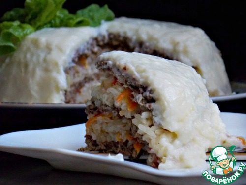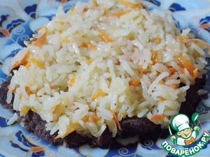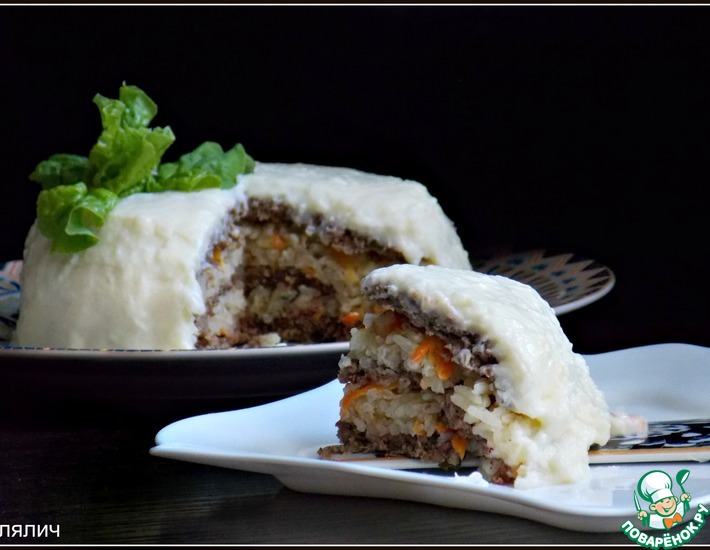 На сервировочное блюдо положить первую мясную лепешку. На нее положить 1/2 риса. Снова мясную лепешку и остатки риса. Накрываем последней мясной.