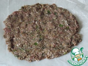 Сначала делаем мясные лепешки. Смешиваем мясной фарш, тертые на мелкой терке лук и чеснок, мелко резанный укроп, масло, специи и соль. Добавить воду и перемешать. На бумаге для выпечки начертить при помощи тарелки с d= 16 см. три круга. Положить фарш и разровнять в пределах круга. Выпекать при t= 200 примерно 20-25 мин. Дать остыть.