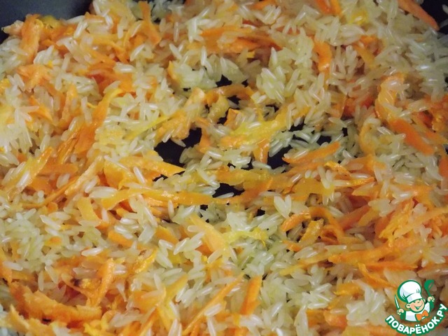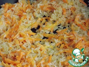Пока наши мясные лепешки готовятся делаем рисовую прослойку. В сковороду налить масло. Положить тертую морковь и промытый рис. Посолить и обжарить 5-10 мин. Залить горячей водой и довести до готовности. Дать остыть.