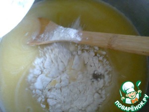 Когда маргарин растает, всыпаем сразу всю муку ( 1 стакан - около 200 гр)