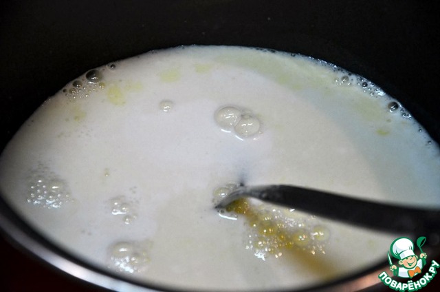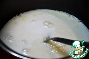 Вливаем содержимое миски и продолжаем размешивать до загустения.