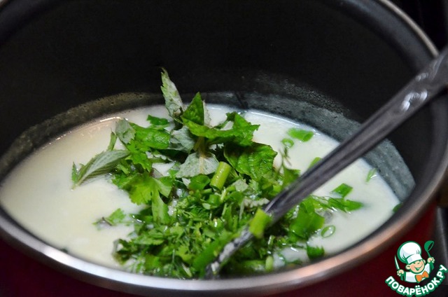 Мяту, кинзу, зеленый лук и базилик моем. Отделяем листья от стеблей и обсушиваем с помощью полотенца. Нарезаем обсушенную зелень и добавляем в кастрюлю с йогуртом.