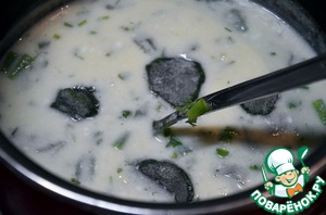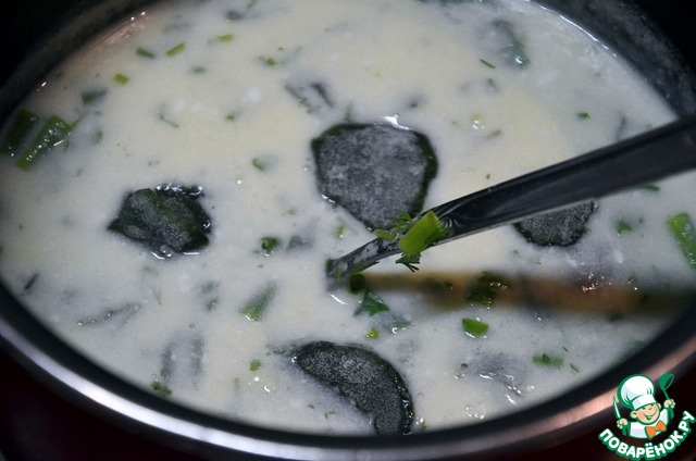 Добавляем в кастрюлю с водой йогурт. Размешиваем венчиком. Посолим.