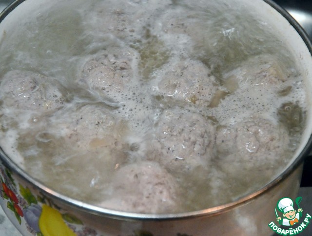 Ставим еще одну кастрюлю с водой на огонь. Посолим получившийся фарш. Вливаем немного воды. Добавляем зиру. Тщательно перемешиваем. Посолим воду во второй кастрюле. Добавляем черный перец горошек. Формируем из фарша фрикадельки и выкладываем их в кипящую воду. Отвариваем.