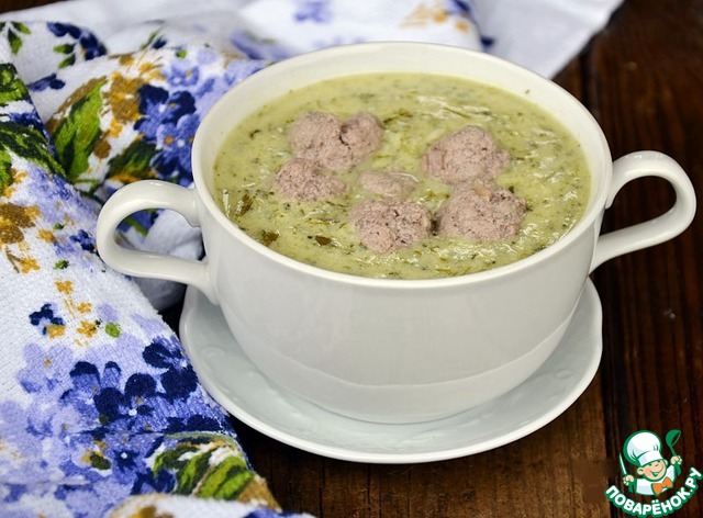 Добавляем немного бульона из-под фрикаделек в суп. Выкладываем фрикадельки в глубокую тарелку. Заливаем супом. Приятного аппетита!
