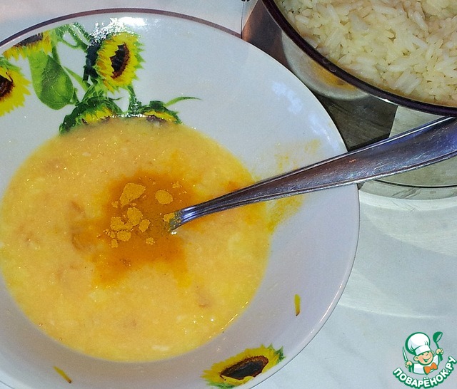 1/4 - ую часть риса отложила для поджарки ( казмах ) и в него вылила яичную смесь. Рис хорошо перемешала. Казмах – это та прокладка между дном кастрюли и основной массой риса, которая обязательно должна быть внизу риса, а в готовом блюде сверху.