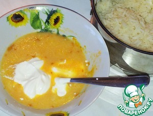 Туда же положила сметану и хорошо перемешала. Эту смесь добавлю в рис для поджарки.