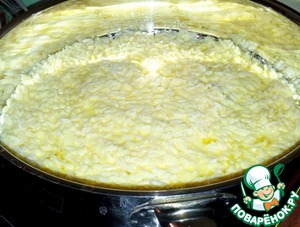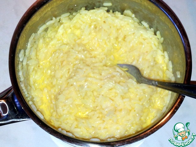 Добавить 3 ст. л горячей воды и хорошо перемешать. За 10 минут до конца готовности риса эту смесь вылить в рис со всех сторон понемногу. В центр горки положить теплёное масло 1 ст. л и закрыть крышкой.