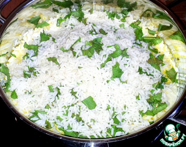 Оставшуюся часть риса смешала с конским щавелем, пересыпала его в сковороду на рис - поджарку и сделала рисовую горку подняв со всех сторон в центр ложкой. Сковороду закрыла крышкой и установила плиту на самую маленькую температуру.