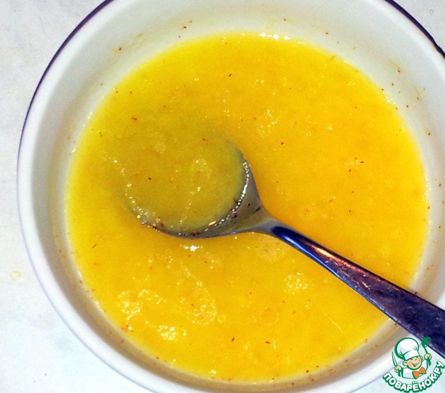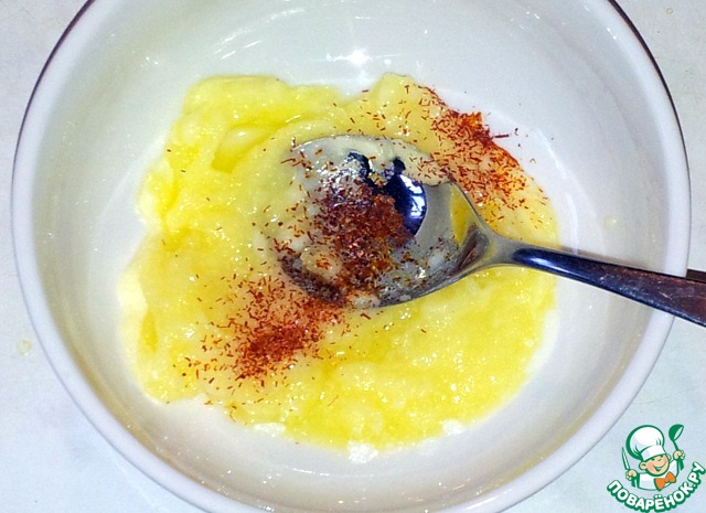 Топлёное сливочное масло 1 ст. л положить в миску и насыпать щепотку шафрана.