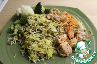 Рис я использовала длинозернный, пропаренный "Индика". Промыла его до чистой воды. Затем в воду насыпала 3 ст. л соли ( как оригинальном рецепте ) и залила рис на 3 часа. Рис впитал всю воду. Он стал рассыпчатым и объём его увеличился... ( Время приготовления блюда не включает замачивание риса ( 3 час ).