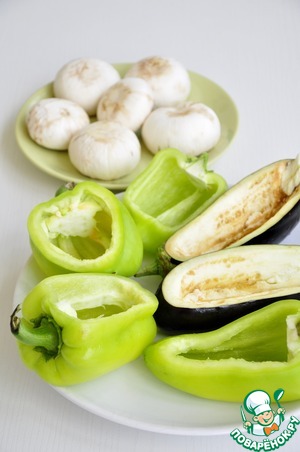 У перцев и баклажанов срезать вдоль небольшую часть. Перцы очистить от семечек, у баклажанов выскоблить сердцевину, хорошо смазать оливковым маслом, посолить. Шляпки грибов очистить от кожицы, удалить ножку, отварить в подсоленной воде минуты 4.