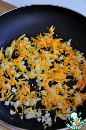 Нарезать мелко нарезанный лук, натереть на крупной терке очищенную овощечисткой морковь. Обжарить в небольшом количестве масла до прозрачности.