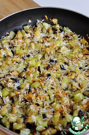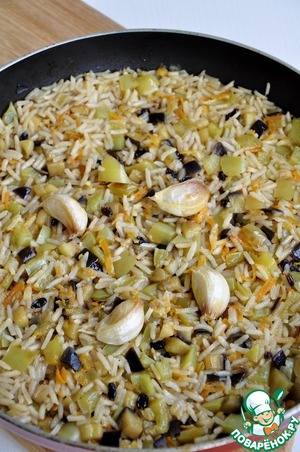 Когда бульон немного выкипит, добавить чеснок и готовить пока бульон весь выпарится и рис приготовится. Нафаршировать овощи готовым пловом, поставить в духовку на 10 минут.