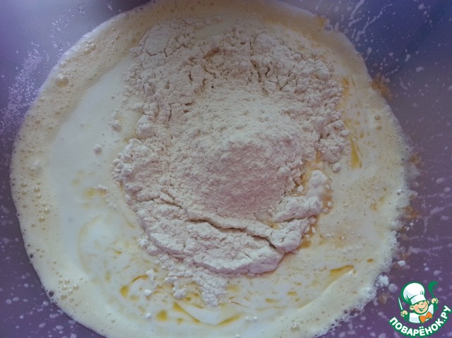 В яичную смесь добавить сметану, муку, сливочное масло и хорошо перемешать